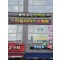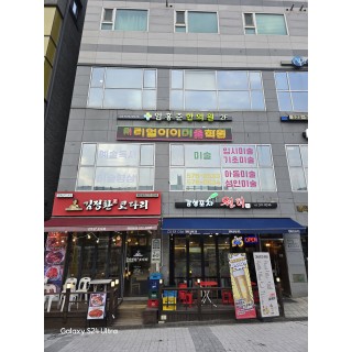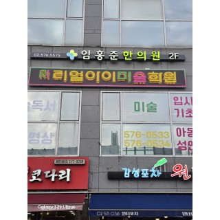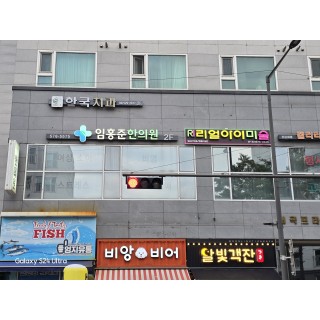 비조명플렉스 간판 위에, 갈바재질로 된 글자채널 뒷면으로 웜톤(전구색)의 조명이 발광되는 간판과 일반적인 알루미늄 전광 채널간판